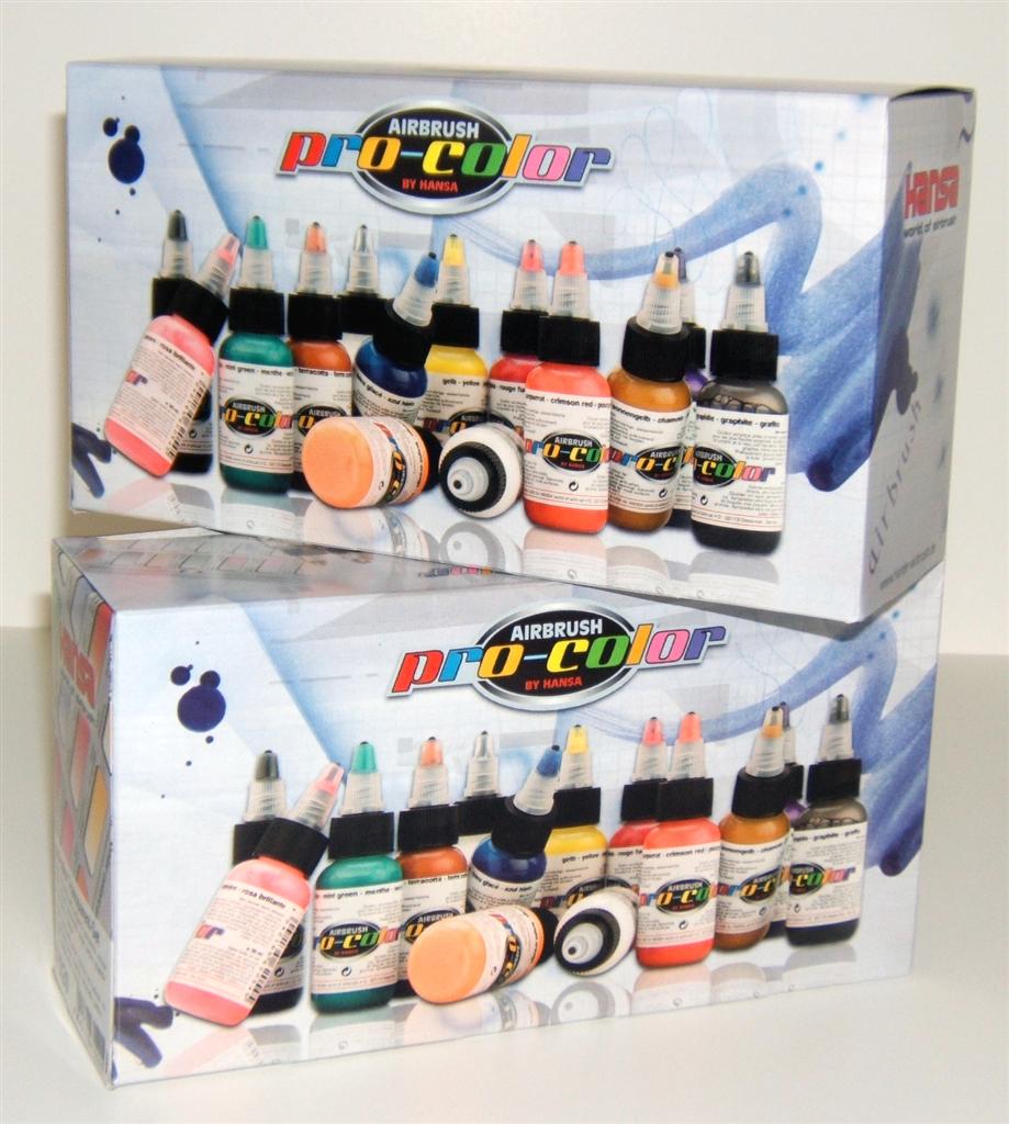 pro-color Opaque-Set: kanariengelb, feuerrot, fuchsienrot, magenta, königsblau, ultramarin, grasgrün, tannengrün, weiss, schwarz, fleisch II, Reiniger 30ml
